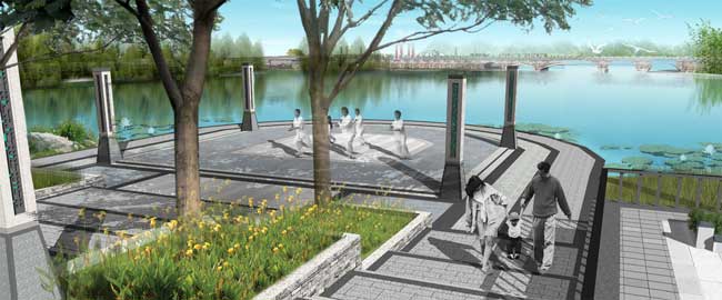 该方案以一环连两湖,三轴串八景,五区话古今,,动静两相宜的景观结构。共分为酒香礼颂、津渡迷踪、华汲岸雅、彩境盈风、柳孜遗韵、云影湖波六个部分。